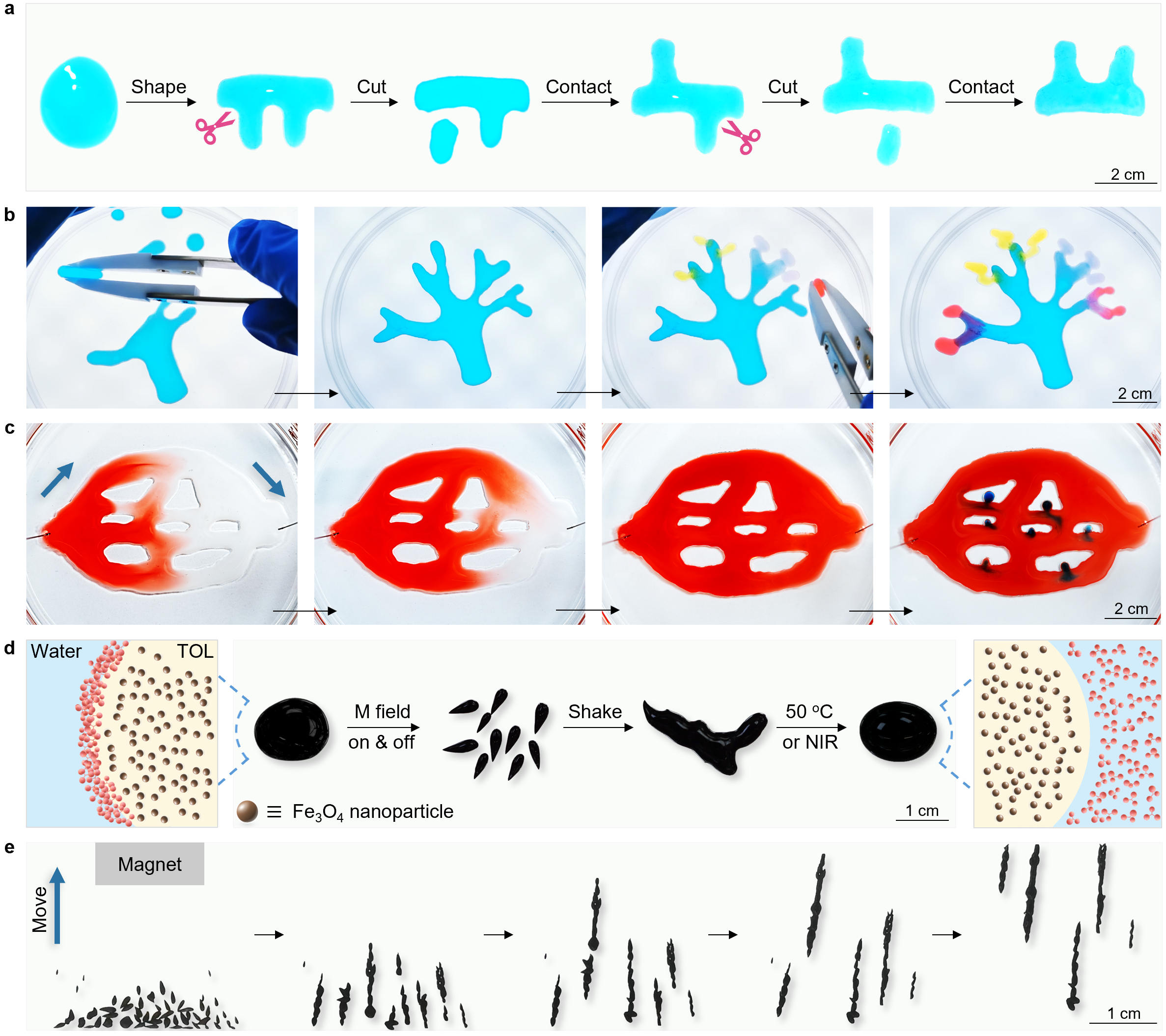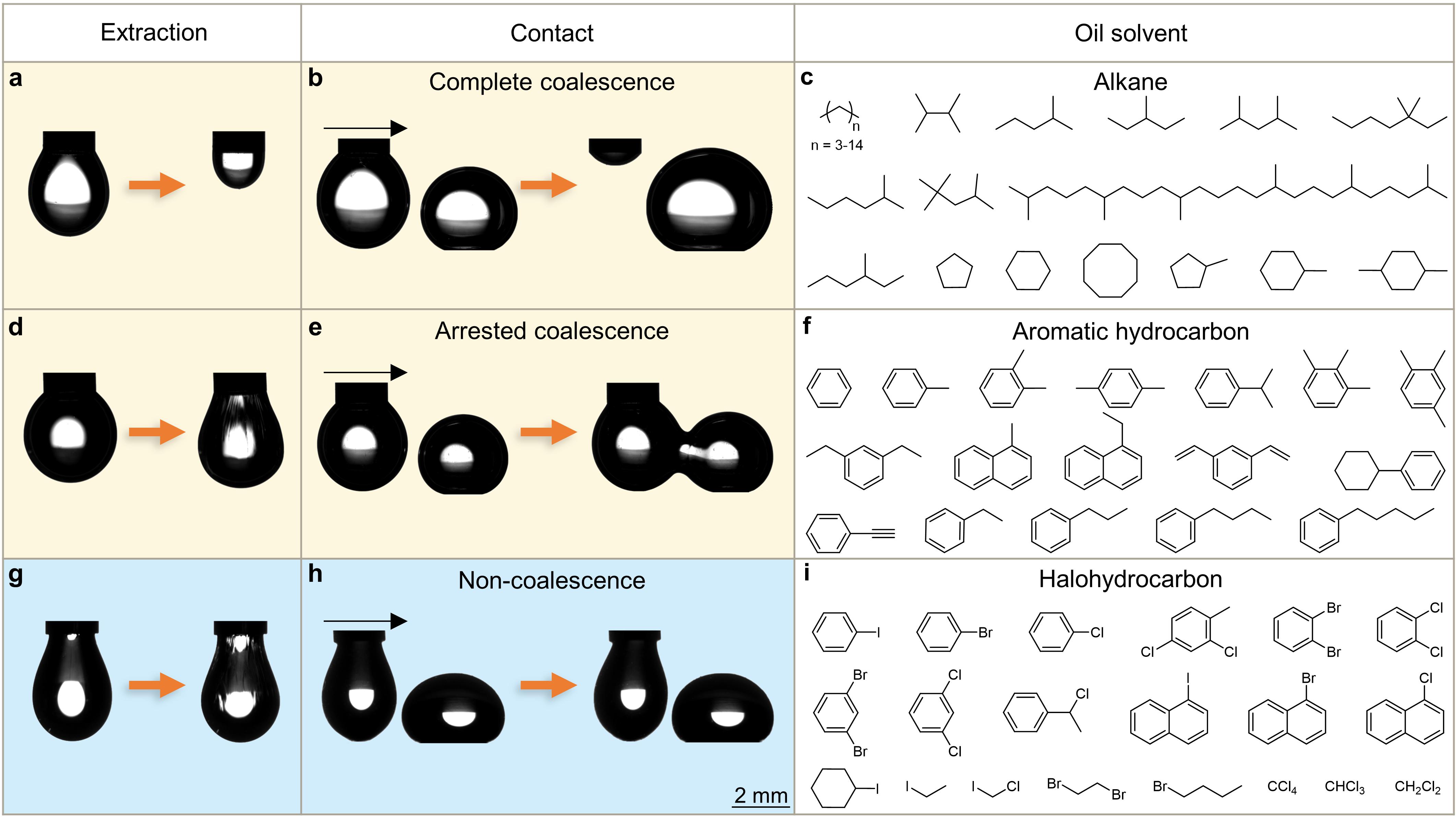 图2. 水/烷烃、水/芳香烃、水/卤代烃三种体系中液滴的塑形和融合行为