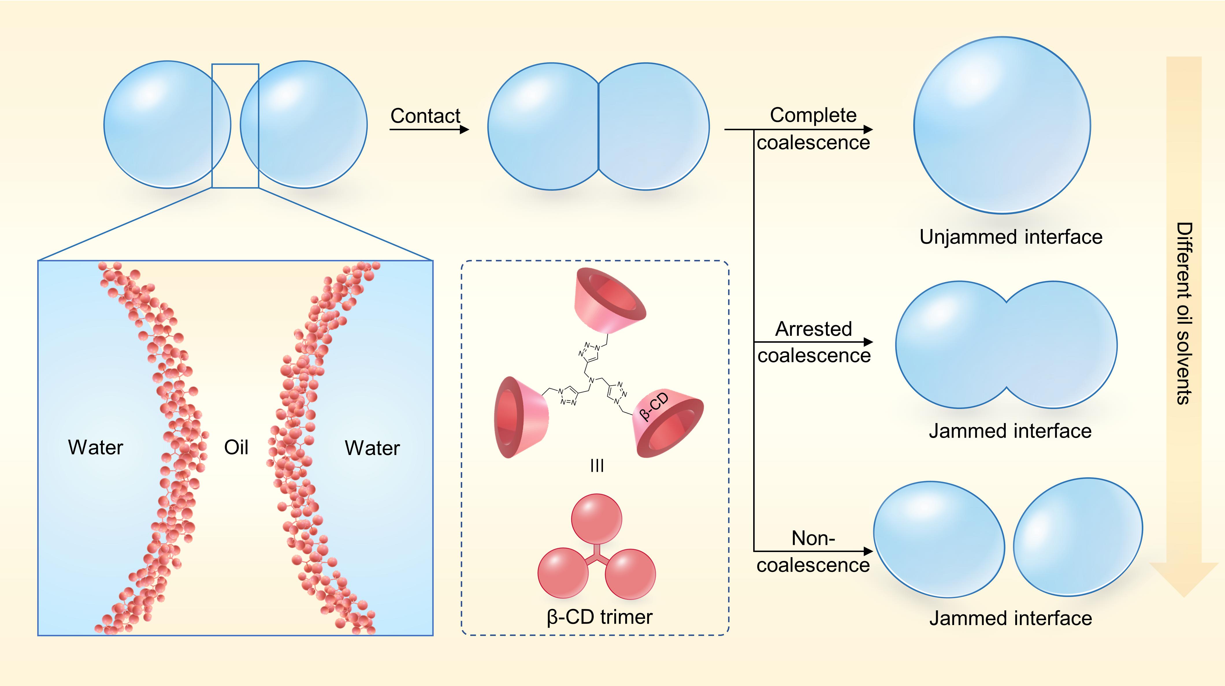针对上述问题,研究团队提出了一种利用环糊精衍生物β-CD trimer稳定结构化液体的简单方法。该方法无需在油相中额外添加配体,β-CD trimer通过与油相溶剂分子的主客体相互作用,可快速在水/油界面组装(图1)。通过系统研究β-CD trimer在水/烷烃、水/芳香烃、水/卤代烃三类水/油体系的界面组装,结果表明,不同体系中β-CD trimer的界面结合能存在显著差异,进而引起界面组装体力学性质的变化,导致了不同的液体塑形和融合行为(图2)。特别是,基于芳香烃/水体系构筑的结构化液体,由于堵塞界面中含有大量自由体积,液体表现出一种特殊的受限融合行为:液体接触时仅在接触区域发生融合,其他区域保持原有结构不变。这一发现解决了液体刚性界面和可控融合之间难以兼顾的矛盾,为结构化液体的再加工和复杂流体器件的构筑开辟了新路径(图3,图4)。